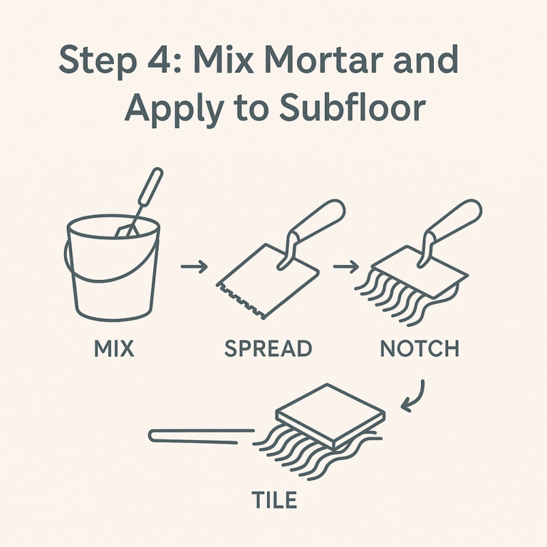 Using a notched trowel, spread the mortar evenly over a small section of the subfloor. Hold the trowel at a 45-degree angle to create consistent ridges. These ridges help the tile bond securely and ensure the right depth for a level installation.
