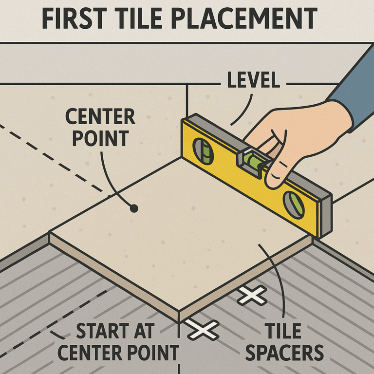 Using the chalk lines from your layout planning, start at the room’s center or your chosen focal point. This ensures tiles are evenly distributed across the space.